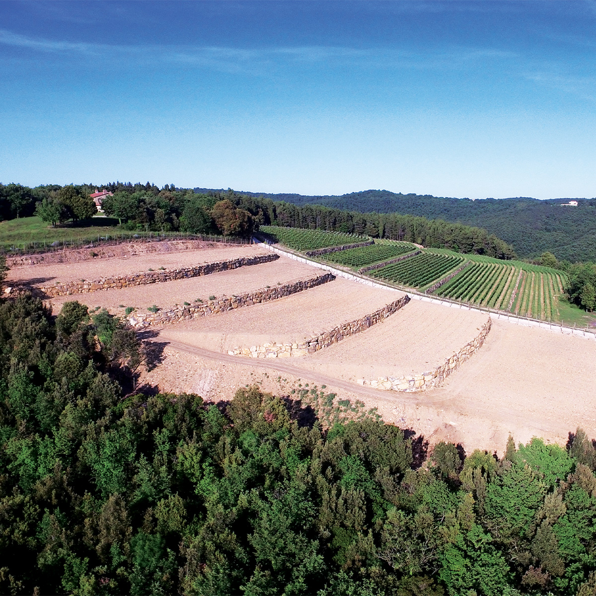 Tenuta Sette Cieli, or the 'Estate of the Seven Skies,' sits atop a hill at 400 meters with incredible views in every direction. Today, there are 10 hectares of high-density vineyards planted to Cabernet Sauvignon, Cabernet Franc, Merlot, and Malbec. To this, in 2018, a further 36 hectares was added, of which 9 hectares are under vine at altitudes of between 70 and 140 meters, the majority of which falls within the Bolgheri DOC.